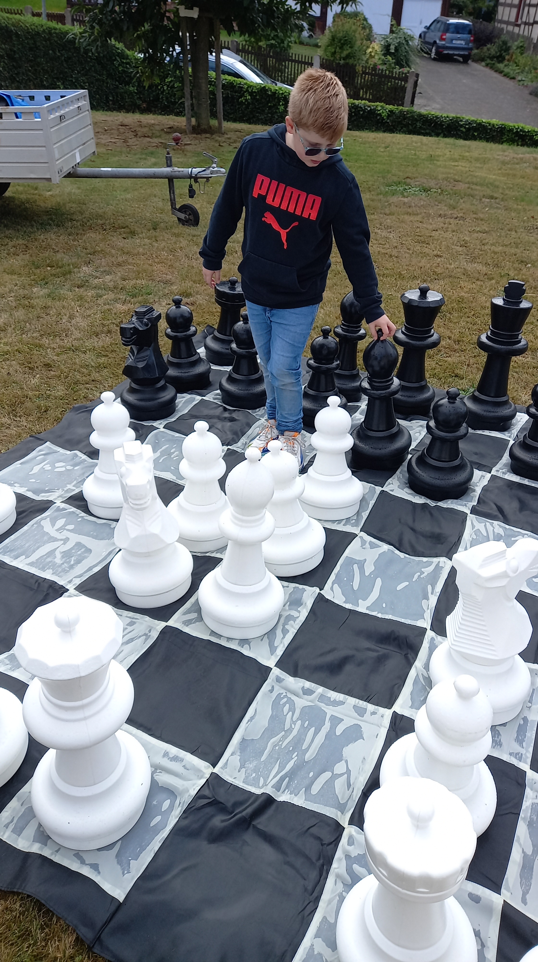 am Samstag, den 13.9.2025, gab es eine Aktion mit Gartenschach direkt vor Ort auf dem Bauernmarkt in Ahlshausen. Einige Kinder hatten Freude an dem Angebot und zeigten trotz wechselhaftem Wetter Interesse am Schachspiel.